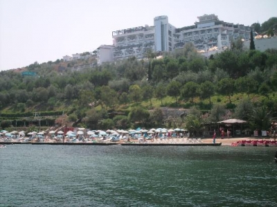 Pozitie Hotelul este situat pe malul marii, la 75 km de aeroportul din Izmir si la 8 km de centrul oraşului Kusadasi. Capacitate de cazare Hotelul dispune de un corp principal si 21 de bungalouri. In cladirea principala sunt: 92 camere Standard (26mp), 52 junior suite room (32mp). In bungalouri sunt: 82 camere standard, 86 family room cu 2 camere, 40 family room cu 3 camere. Camerele Dispun de: baie (in hotel), dus (in bungalow) telefon, televizor, aer conditionat, minibar, seif. Facilitati si servicii 2 restaurante principale, 4 restaurante a la carte, 6 baruri, coafor, centru comercial, sala de conferinta (200 pers). | |||||||||||||||||||||||||