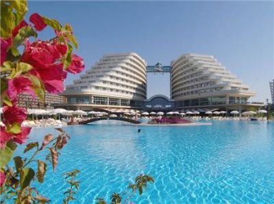 Hotelul dispune de un numar total de 696 camere, 425 camere standard ( 28-35 m2, 3+1 pers ), 122 camere comunicante ( 2 camere standard cu usa comunicanta intre ele), 11 camere pentru persoanele cu dezabilitati si pentru nefumatori, 14 camere junior suit ( 75 m2, max 4 pers, living room + dormitor, 2 bai, terasa). Toate camerele sunt dotate cu: balcon, baie privata, uscator de par, aer conditionat, telefon direct, mocheta, seif, mini bar ( apa, bauturi racoritoare, bere, in fiecare zi), TV satelit, canale de muzica. SERVICII: Ultra All Inclusive – mic dejun devreme, pranz, cina, bufet deschis, ceai, cafea, gustari tarzii, bauturi locale racoritoare si alcoolice Nu sunt incluse in concept: restaurantele A’la Carte ( copii cu varstele cuprinse intre 0-6 ani nu au acces), buturile fresh din fructe, room service. FACILITATI: Restaurant principal –Turkuaz, bufet deschis ( nu se servesc bauturi din import); restaurante a’la carte: Miracolo ( specific italian), Anatolia ( bucatarie turceasca), Lagos ( specific pescaresc), Mexican ( specific mexican); lobby bar ( bauturi locale, 10.00-02.00), bar la piscina ( bauturi locale, 10.00-23.00), bar pe plaja ( bauturi nealcoolice); Cu plata: doctor, spalatorie, baby sitting, telefon, fax, internet cafe, centru comercial. PLAJA: Plaja privata de nisip, umbrele de soare, prosoape de plaja, sezlonguri – fara plata SPORT SI DIVERTISMENT: Piscina exterioara si interioara, piscina pentru copii, tobogane, centru fitness, aerobic, sala de gimnastica, mini fotbal, fotbal pe plaja, volei, baschet, tenis de masa, darts, teatru, disco in aer liber. Fara plata: nopti turcesti, pub, muzica live, disco in aer liber, cinema,programe de divertisment in timpuk zilei, pentru adulti, mini club ( 4-14 ani). CONTRA COST: lectii de tenis, iluminatul terenului de tenis, biliard, solar, masaj, spa, salon de infrumusetare, internet, sporturi nautice. | ||||||||||||||||||||||||||